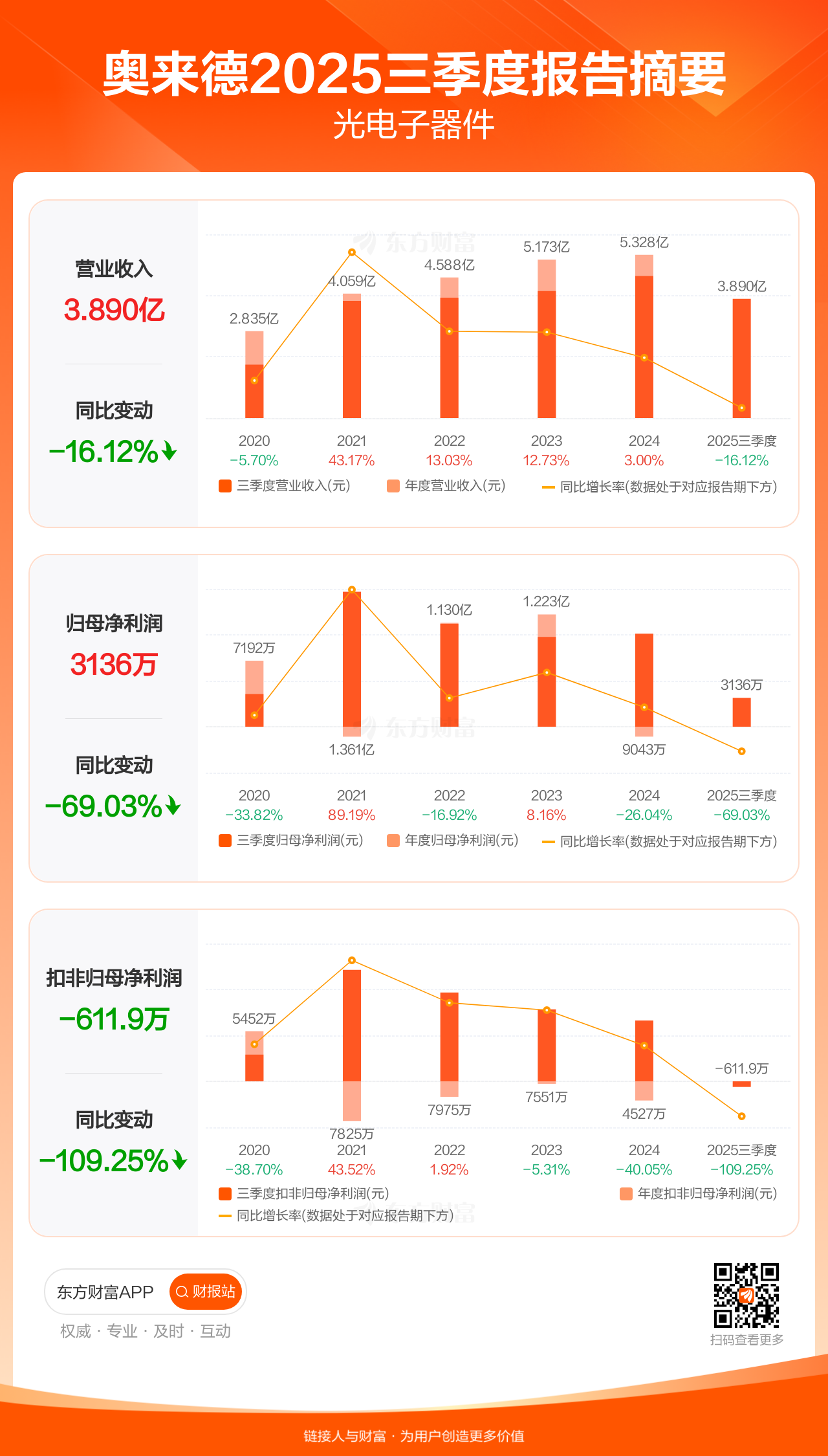 奥来德10月31日发布2025年三季报显示,公司前三季实现营业收入3.89亿元,同比下滑16.12%;归母净利润3135.61万元,同比下滑69.03%;扣非归母净利润-611.89万元。