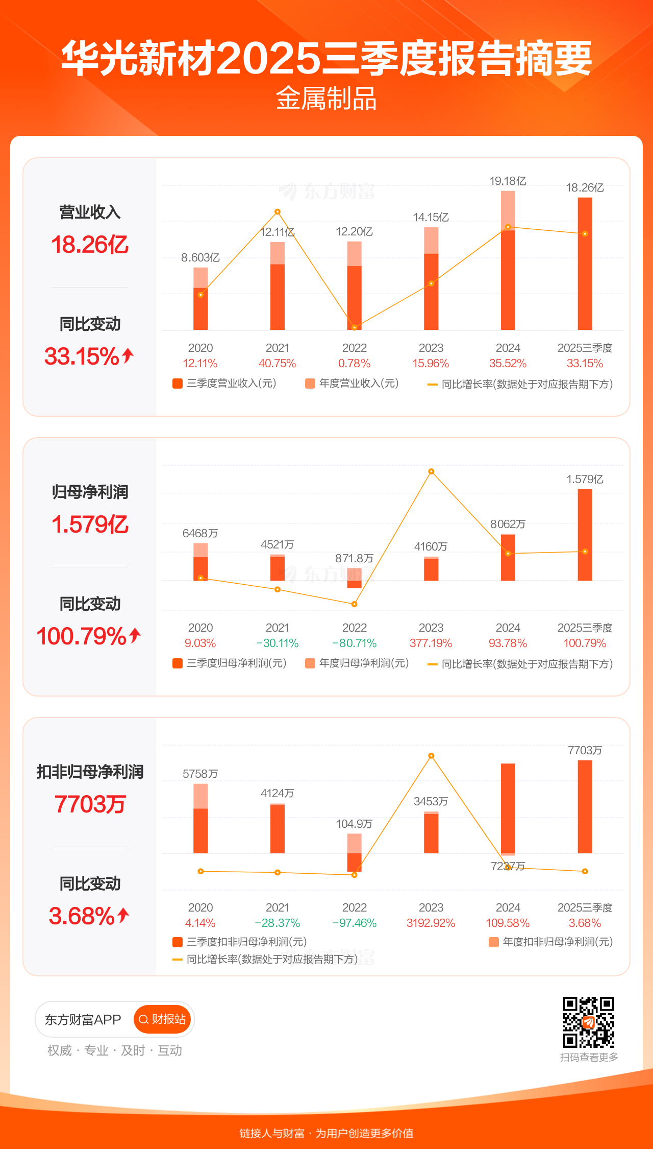 华光新材10月31日发布2025年三季报显示,公司前三季实现营业收入18.26亿元,同比增长33.15%;归母净利润1.58亿元,同比增长100.79%;扣非归母净利润7702.81万元,同比增长3.68%。