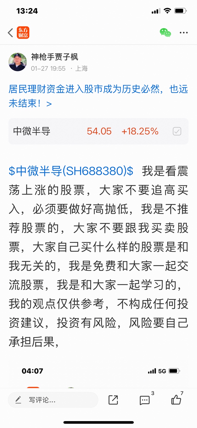 $中微半导(SH688380)$ 这个股我是一月二十一号发表文章看涨的股票,大家不要追高买入,必须要做好高抛低吸,我是不推荐股票的,大家不要跟我买卖股票,大家自己买什么样的股票是和我无关的,因为我是和大家一起交流股票,我是和大家一起学习的,我的观点仅供参考,投资有风险,风险要自己承担后果,