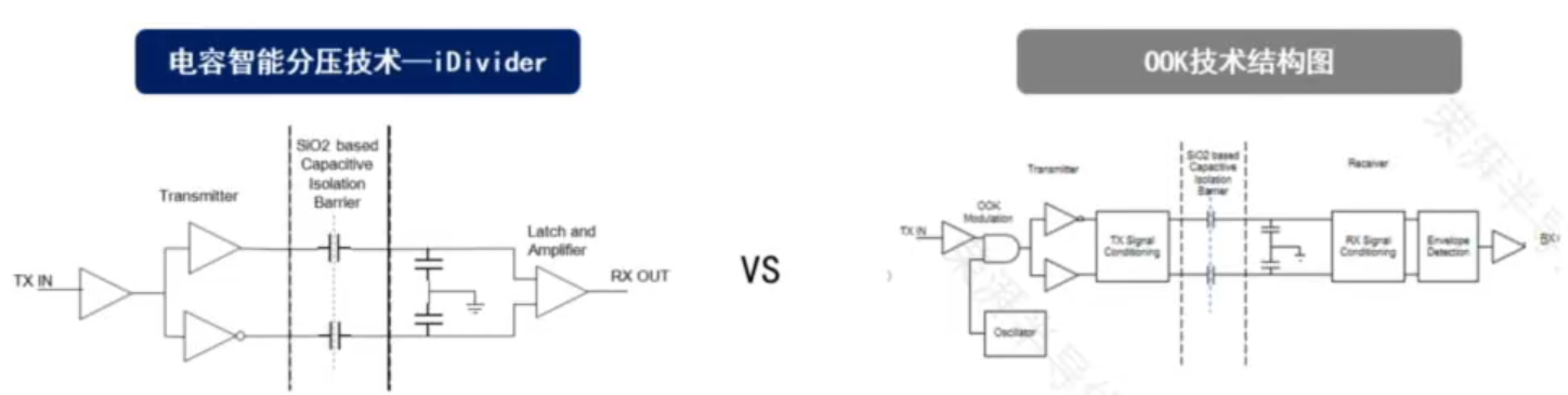 顾名思义,容耦隔离是通过电容耦合器实现,目前主流的技术是采用高频调制解调技术(如OOK)传输数据,如国内隔离芯片龙头纳芯微在半年报中也将OOK技术列为核心技术之一。