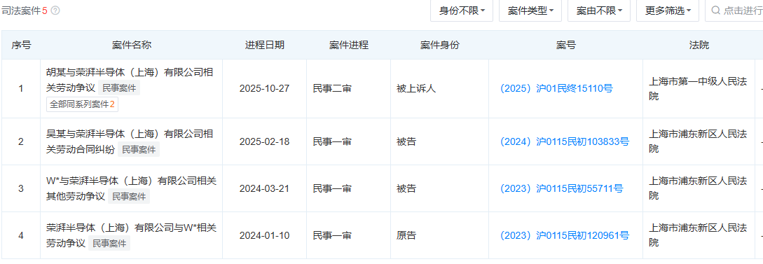 除了业绩和资金问题,荣湃半导体的治理风险也浮出水面。自2023年起,公司陆续卷入多起劳动争议和纠纷,其中最受资本圈关注的,是原董事、销售副总裁胡某与公司的劳动争议案。