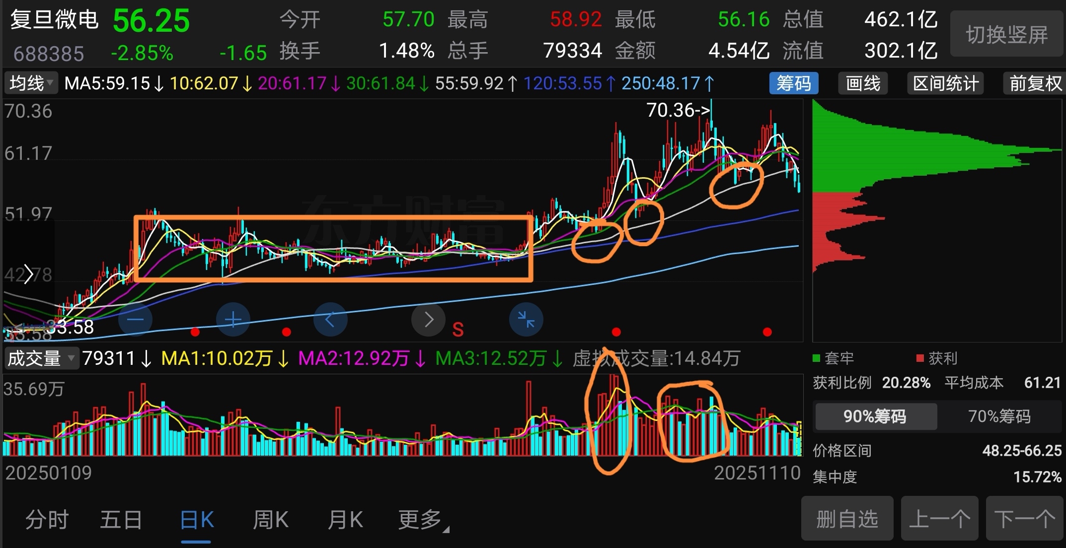 $复旦微电(SH688385)$ 光伏电池大肉医药军工小肉都能落袋了,大盘有危险了,久盘必跌,和之前一样,会有一波再次下探。资金和4月一样,全去炒内循环消费了,一个也是因为快年底了,每年年底都会涨消费。科技股早就说了不要碰,尤其复旦我从9月就说了走势弱,炒股最重要的看量,8月底的上涨有量,后续9月上攻多次勉强过了高点,但是量能在减少,多次又是上影线,我说过怎么上去怎么下来。复旦为何比别人弱,因为每次回调都是去55日线,强势股的回调你们可以去看,基本都是5日线反弹,10日线的都已经算弱了,更别提55日线了,之前让你们换的拓荆可以分析。加上复旦的筹码从9月中旬的那波缩量上涨,底下的获利盘就跑了,所以种种迹象都表明复旦太弱,这一轮下跌会进入之前的中枢,就看能不能企稳吧,预计53附近。不想炒内循环的可以空仓休息了