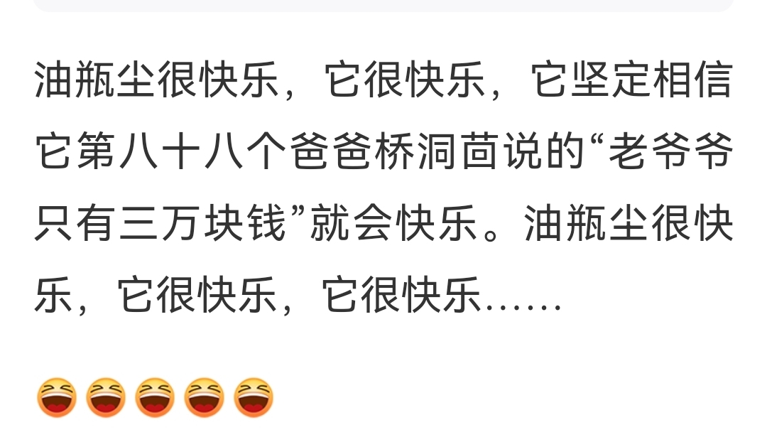传说里只有三万块钱的老爷爷我,祝愿油瓶尘和它那八十八个爸爸都很快乐,一直快乐,永远快乐。
