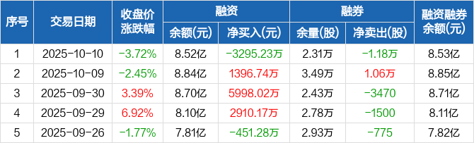 嘉元科技:融资净偿还3295.23万元,融资余额8.52亿元(10-10)