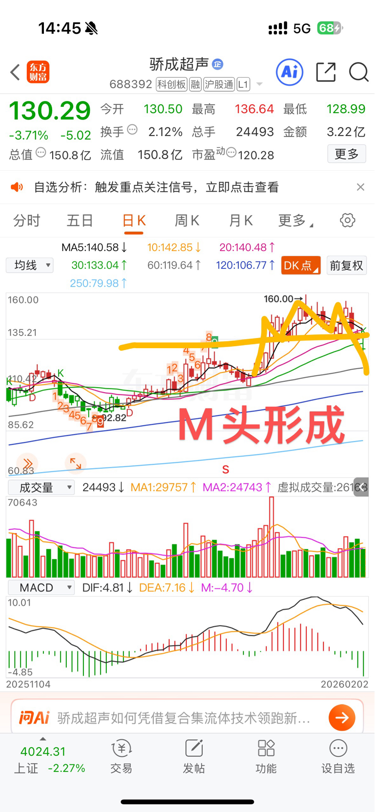$骄成超声(SH688392)$ M头已经形成,大家注意吧,哎