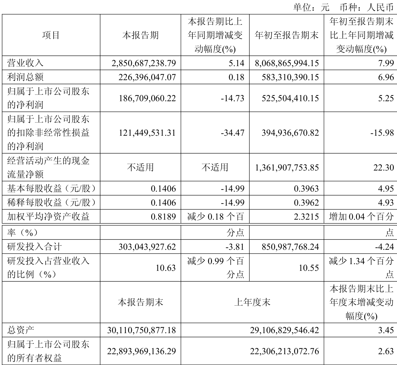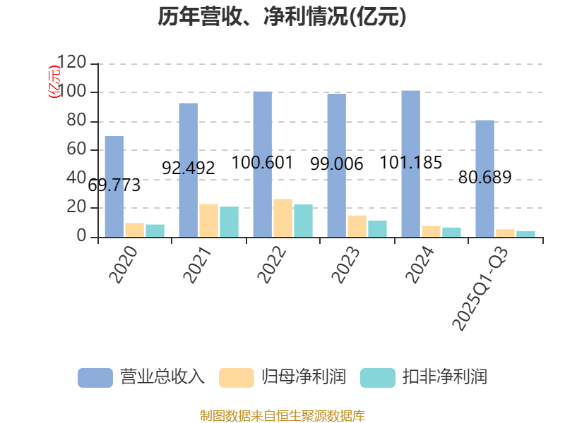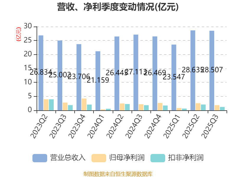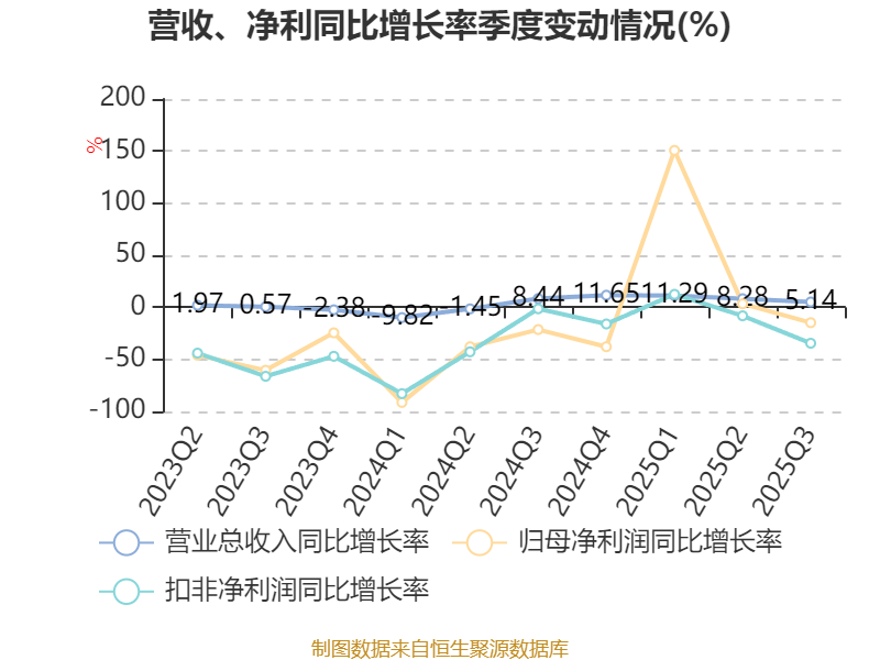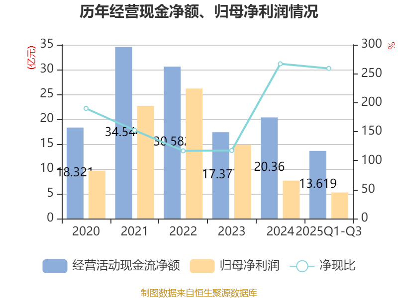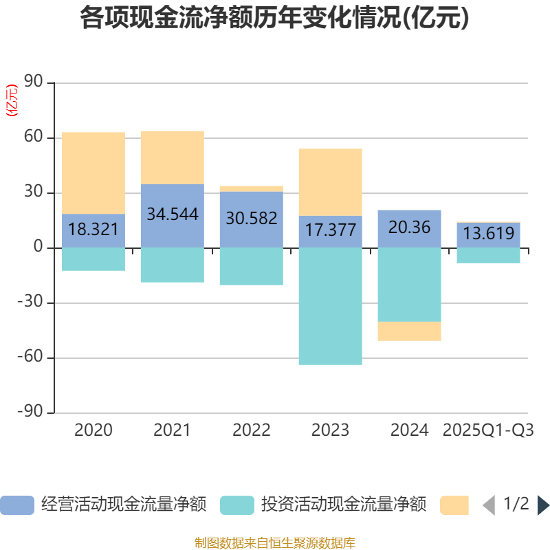 2025年前三季度,公司经营活动现金流净额为13.62亿元,同比增长22.3%;筹资活动现金流净额4261.69万元,同比增加6.2亿元;投资活动现金流净额-8.62亿元,上年同期为-37亿元。