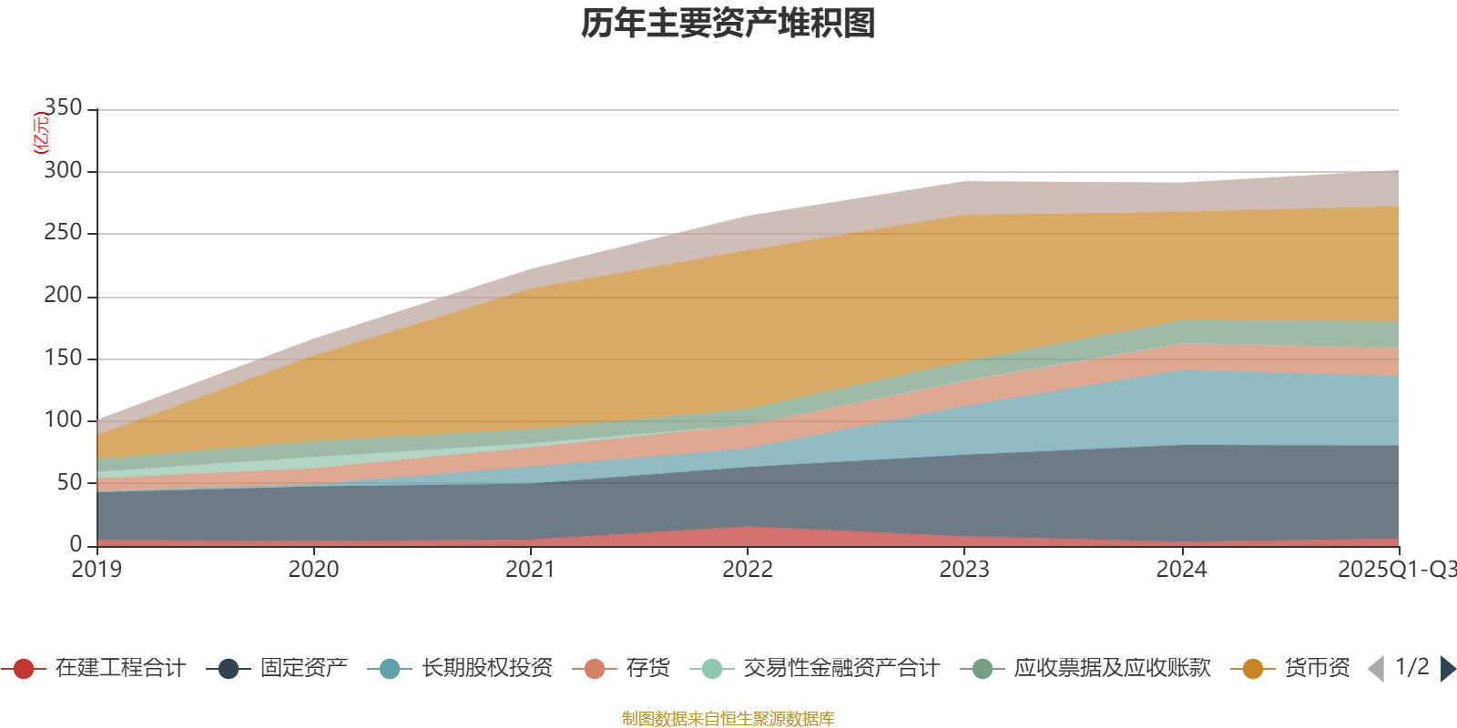 资产重大变化方面,截至2025年三季度末,公司长期股权投资较上年末减少7.11%,占公司总资产比重下降2.11个百分点;固定资产较上年末减少3.55%,占公司总资产比重下降1.8个百分点;其他非流动资产较上年末增加542.32%,占公司总资产比重上升0.89个百分点;货币资金较上年末增加6.21%,占公司总资产比重上升0.8个百分点。
