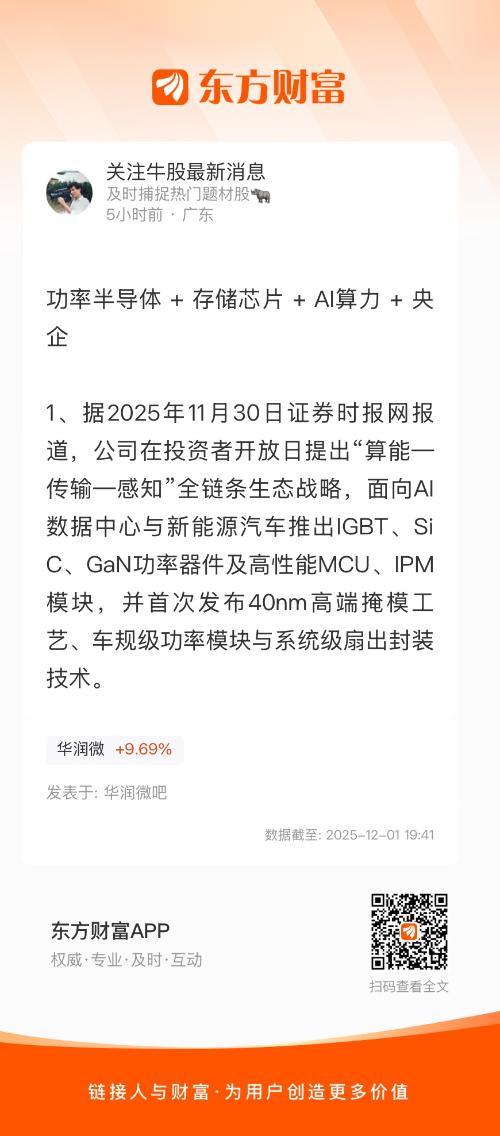 1、据2025年11月30日证券时报网报道,公司在投资者开放日提出“算能—传输—感知”全链条生态战略,面向AI数据中心与新能源汽车推出IGBT、SiC、GaN功率器件及高性能MCU、IPM模块,并首次发布40nm高端掩模工艺、车规级功率模块与系统级扇出封装技术。
