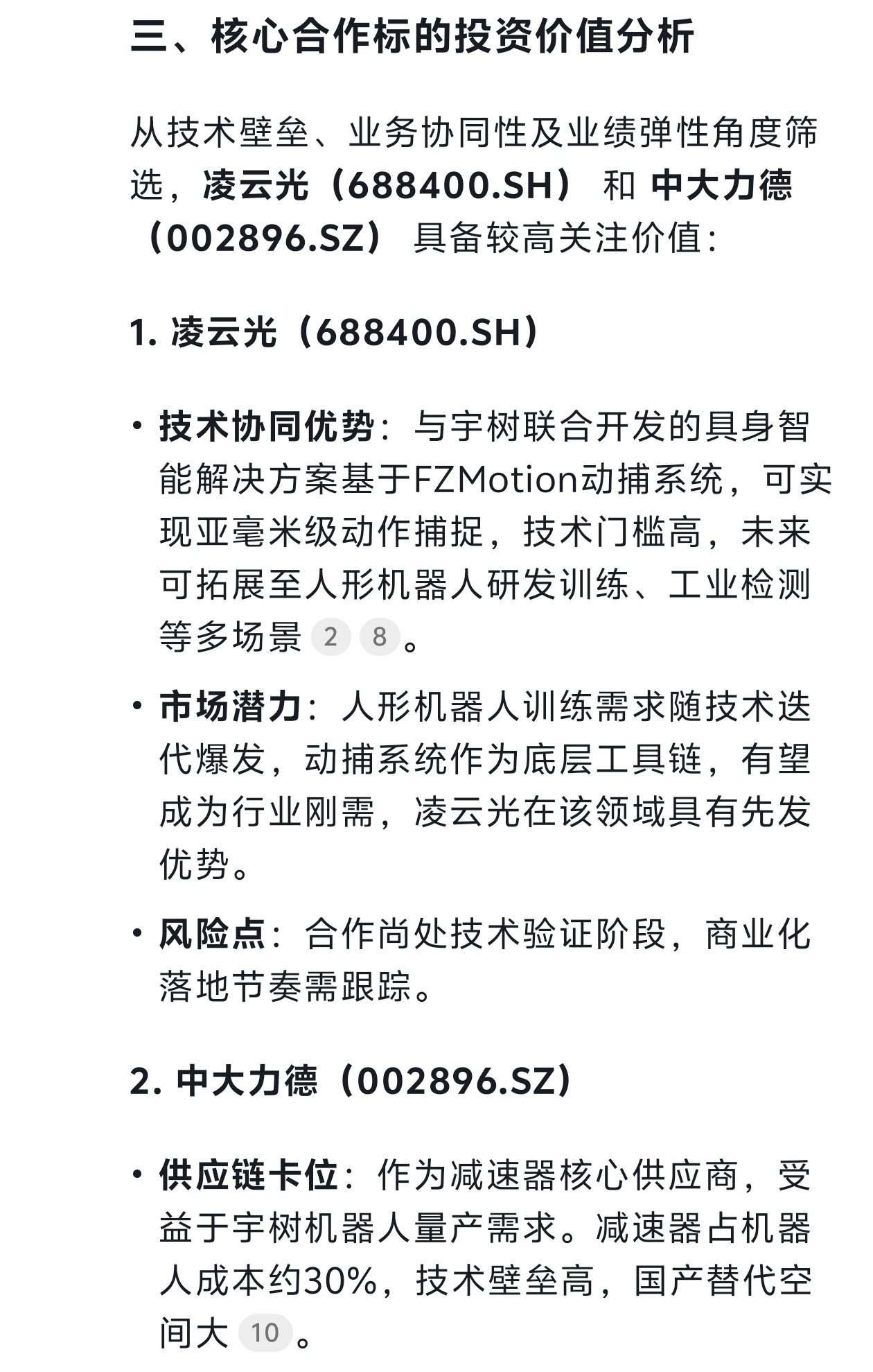 **操作策略**:建议分阶段建仓凌云光,同时跟踪宇树G1/H1销量及具身智能解决方案订单落地情况;中大力德可作为波段操作标的,结合季度财报验证需求放量节奏。