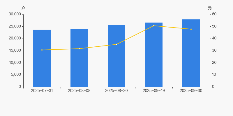 自2025年7月31日以来,公司股东户数连续4期上涨,截至目前增幅为18.39%。2025年7月31日至2025年9月30日区间股价上涨56.18%。