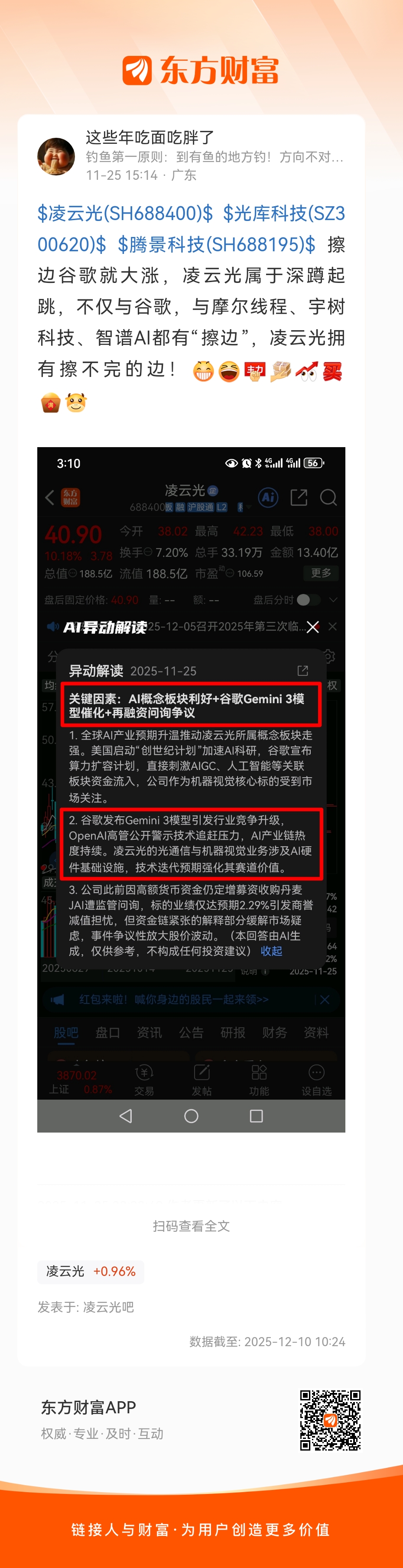 $凌云光(SH688400)$ $光库科技(SZ300620)$ $腾景科技(SH688195)$ 擦边谷歌就大涨,凌云光属于深蹲起跳,不仅与谷歌,与摩尔线程、宇树科技、智谱AI都有“擦边”,凌云光拥有擦不完的边!
