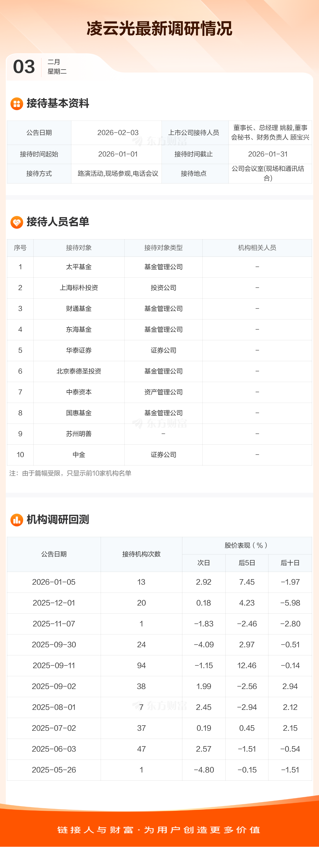 凌云光2月3日公告称,1月1日至1月31日接待太平基金等14家机构调研。接待人员包括董事长、总经理 姚毅,董事会秘书、财务负责人 顾宝兴。