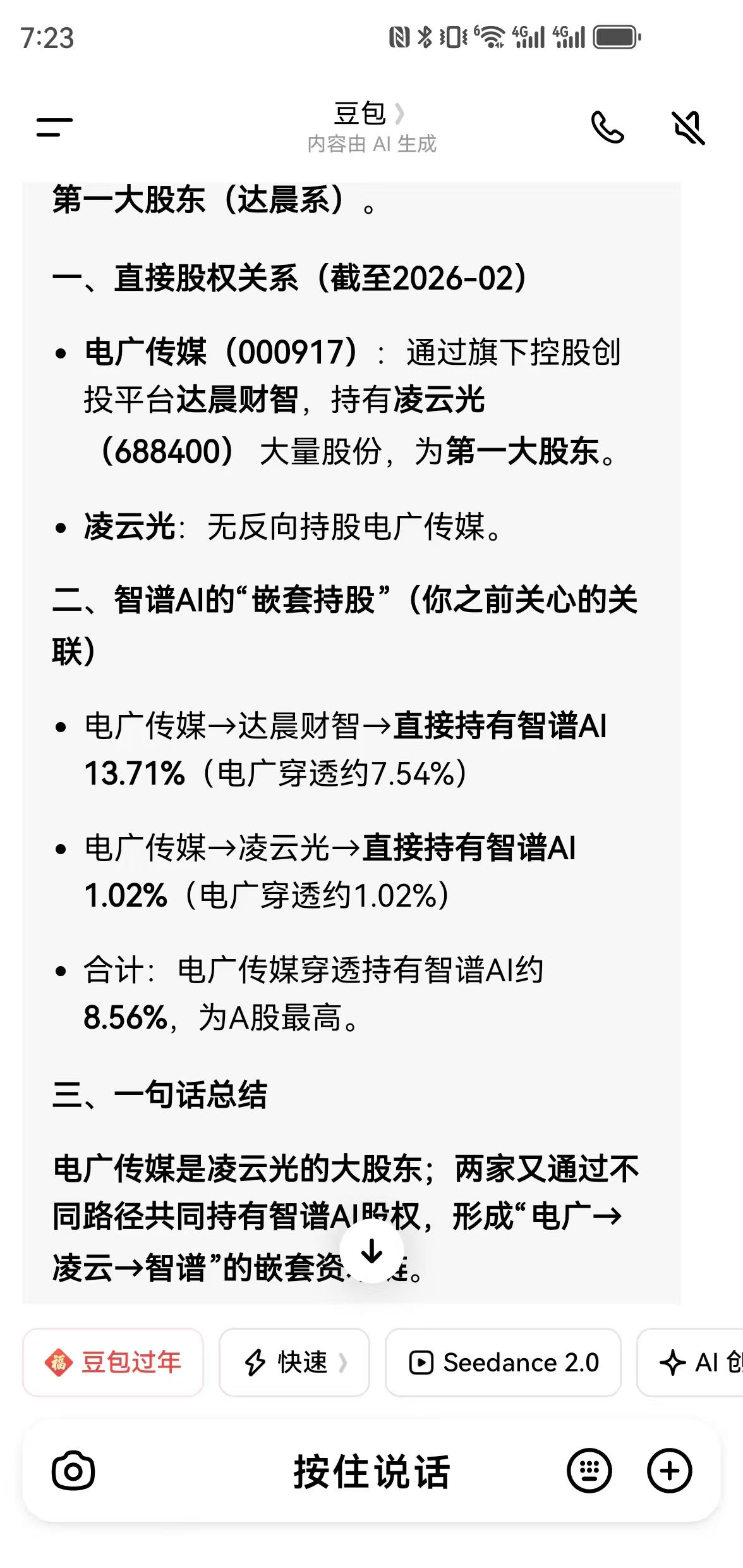 电广传媒000917是凌云光688400的第一大股东?豆包回复。
