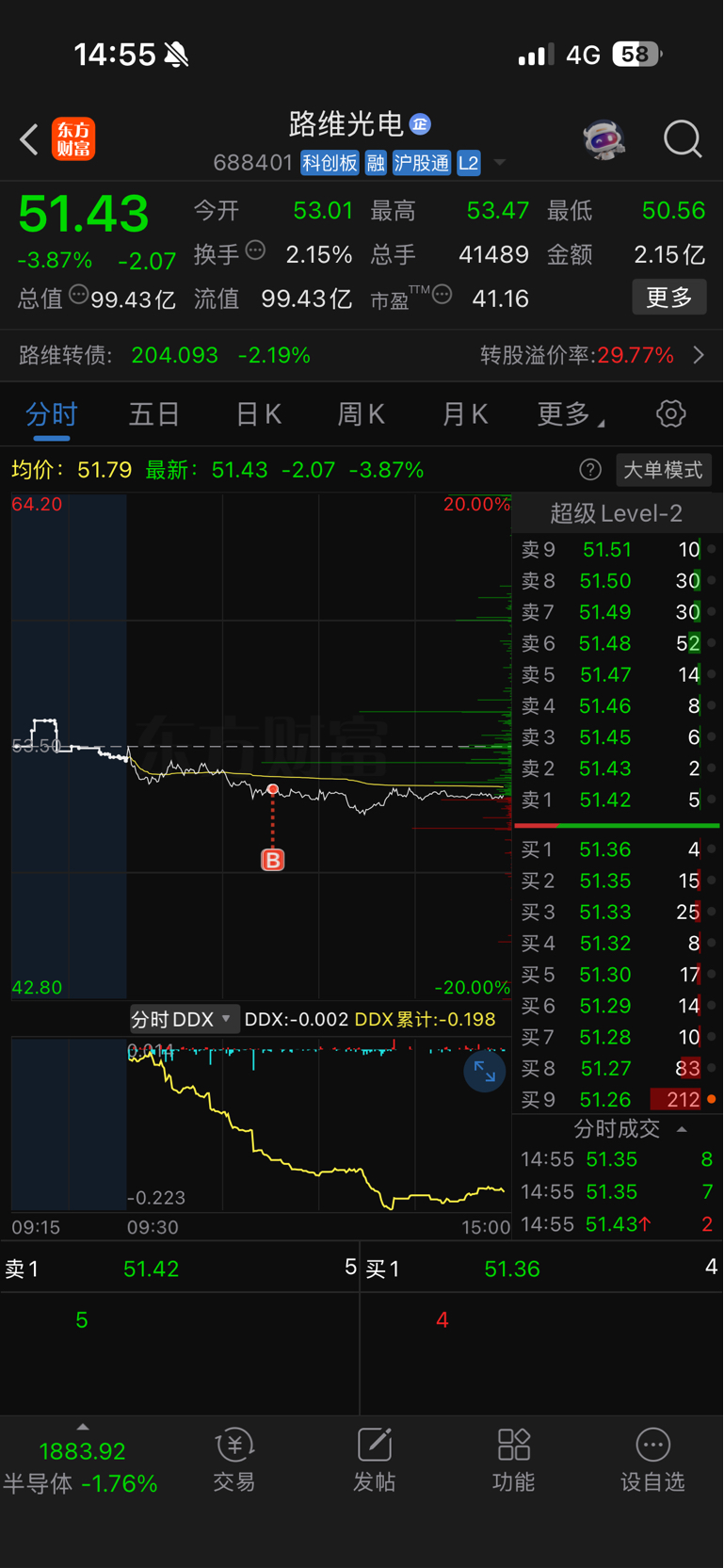 $路维光电(SH688401)$ 被同事忽悠了,上午51.55进来了。希望明天有机会跑吧。不敢太早发出来,免得影响大家操作。