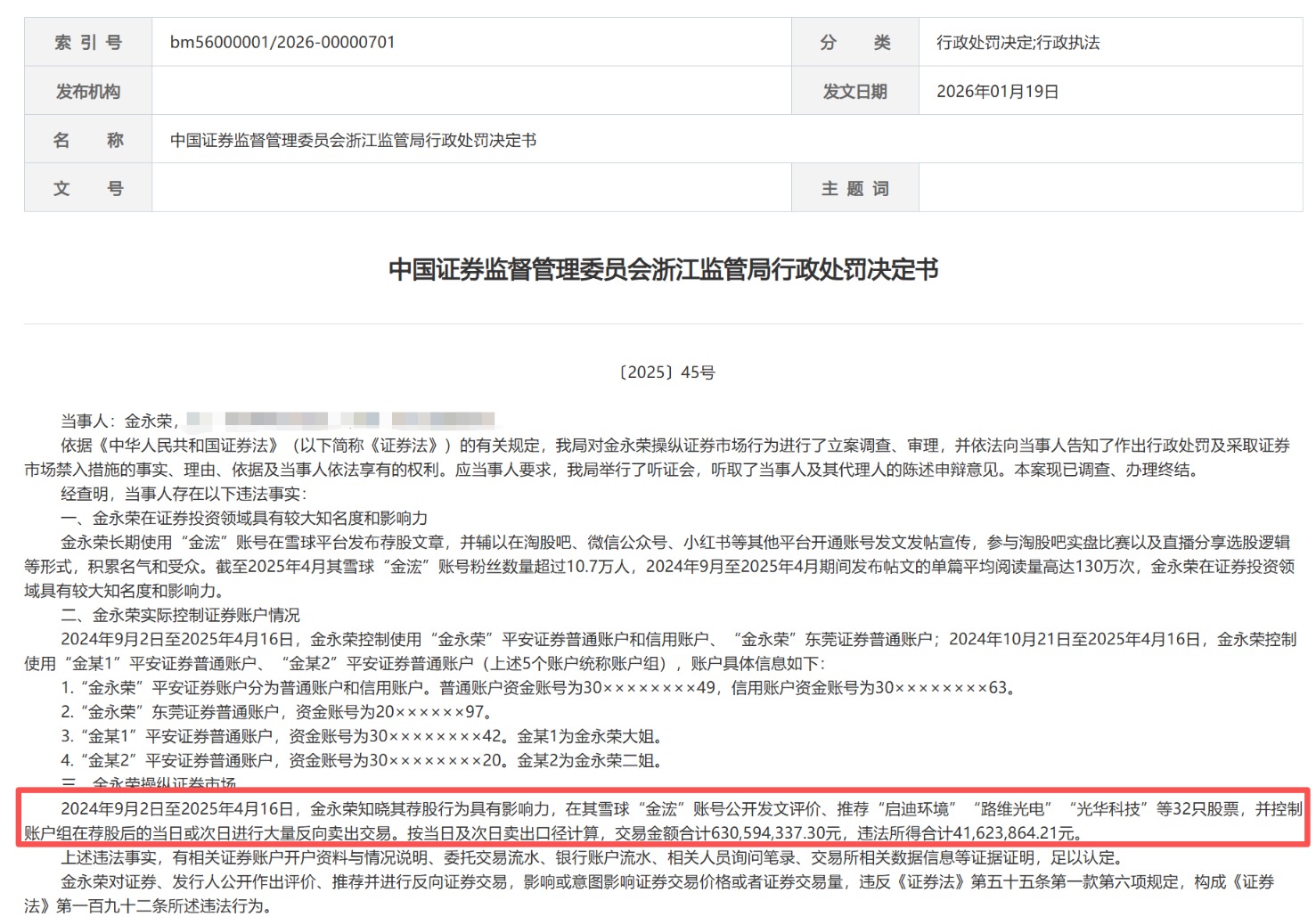 每经AI快讯,1月19日,证监会浙江证监局发布行政处罚决定书,2024年9月2日至2025年4月16日,金永荣知晓其荐股行为具有影响力,在其“金浤”账号公开发文评价、推荐“启迪环境”“路维光电”“光华科技”等32只股票,并控制账户组在荐股后的当日或次日进行大量反向卖出交易。按当日及次日卖出口径计算,交易金额合计630,594,337.30元,违法所得合计41,623,864.21元。