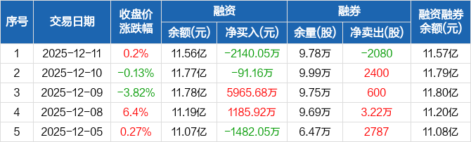 汇成股份:融资净偿还2140.05万元,融资余额11.56亿元(12-11)