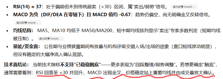 不轻易言底,GPT也是建议40左右买入试错仓。未来的风险也非常明显:当期净亏(Q3 单季为亏损)/YTD 利润显著下滑/经营性现金流大幅为负,若现金流与毛利率在未来两个季度无法改善,基本面承压会持续传导到股价。