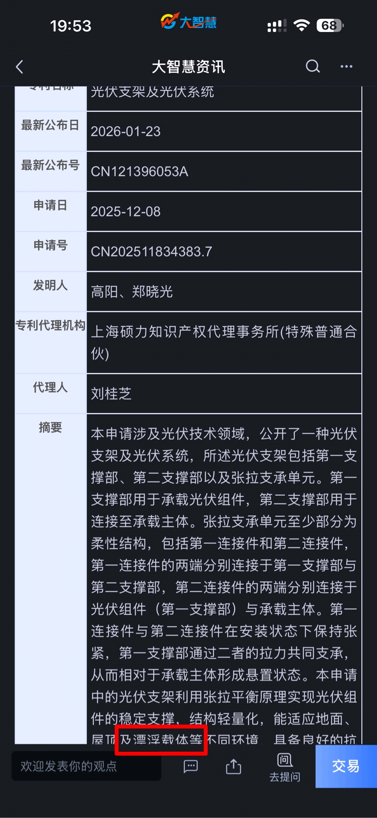 $中信博(SH688408)$ 是不是要数板了,中信博刚通过新专利,涉及用于“漂浮载体”的柔性支架,漂浮载体→不就是卫星吗!!!!