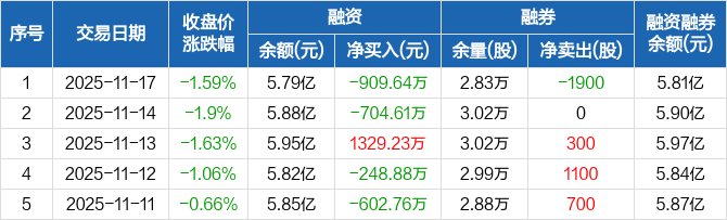 富创精密:融资净偿还909.64万元,融资余额5.79亿元(11-17)