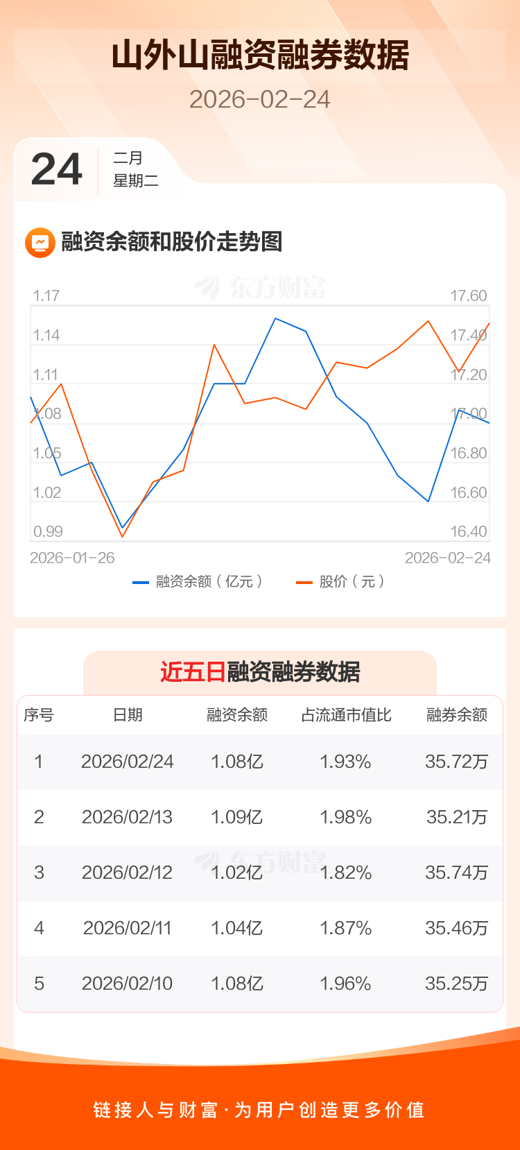 交易所最新数据显示,山外山于2026年2月24日获融资买入685.31万元,融资偿还850.11万元,当日融资净偿还164.8万元。目前,该股融资余额1.08亿,占流通市值比例为1.93%。