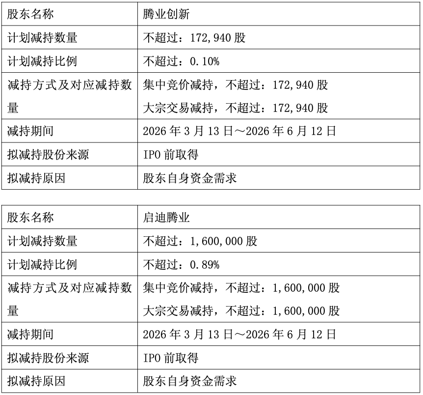 其中,腾业创新拟通过集中竞价或大宗交易方式减持公司股份数量不超过172,940股,即不超过公司总股本的0.10%;启迪腾业拟通过集中竞价或大宗交易方式减持公司股份数量不超过1,600,000股,即不超过公司总股本的0.89%。