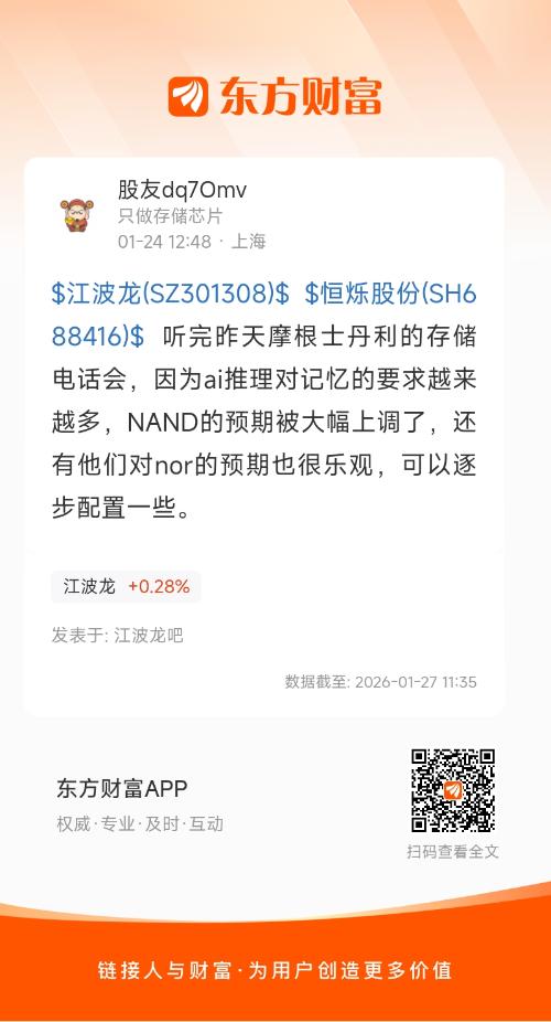 $江波龙(SZ301308)$ $恒烁股份(SH688416)$ 听完昨天摩根士丹利的存储电话会,因为ai推理对记忆的要求越来越多,NAND的预期被大幅上调了,还有他们对nor的预期也很乐观,可以逐步配置一些。