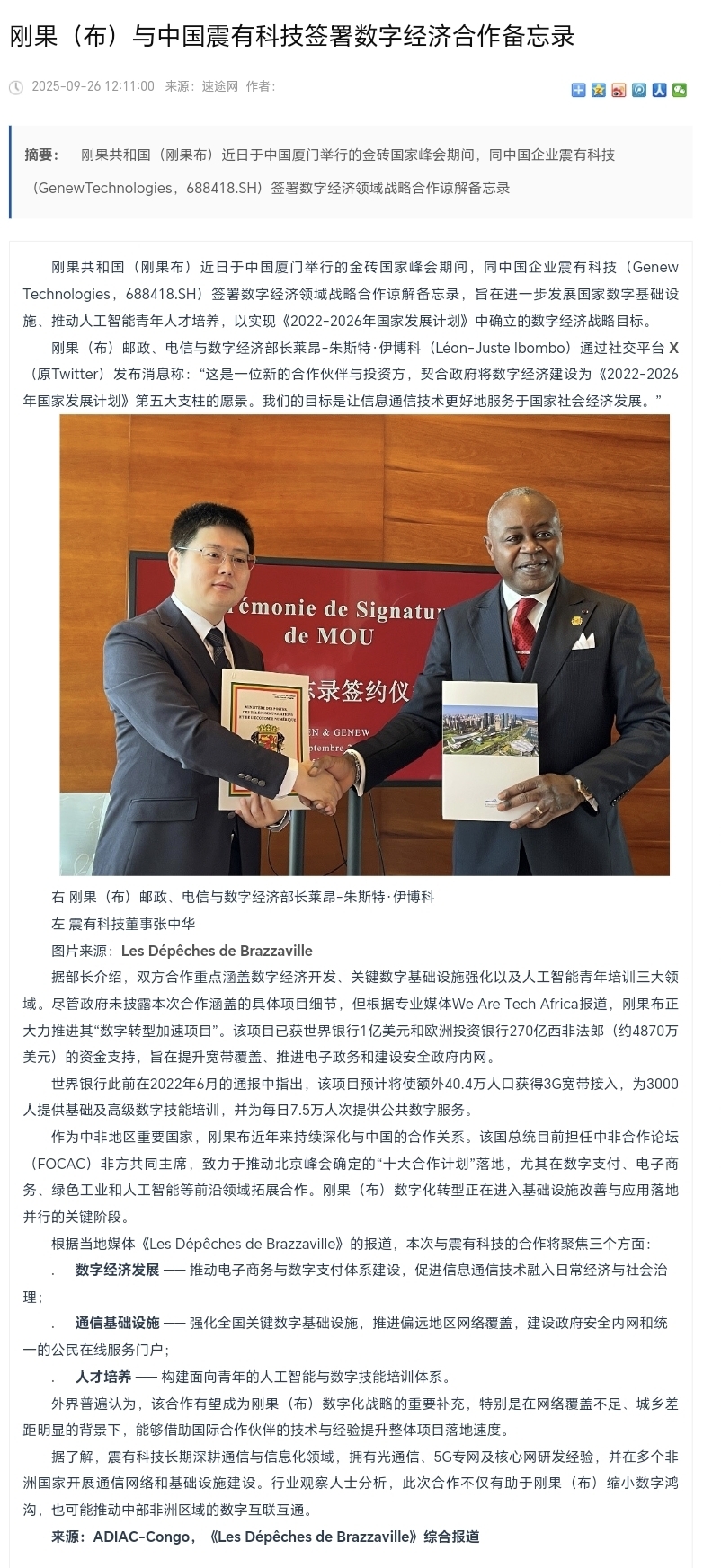 $震有科技(SH688418)$ 9月26号和刚果布签订了备忘录,看看有没有大单吧!