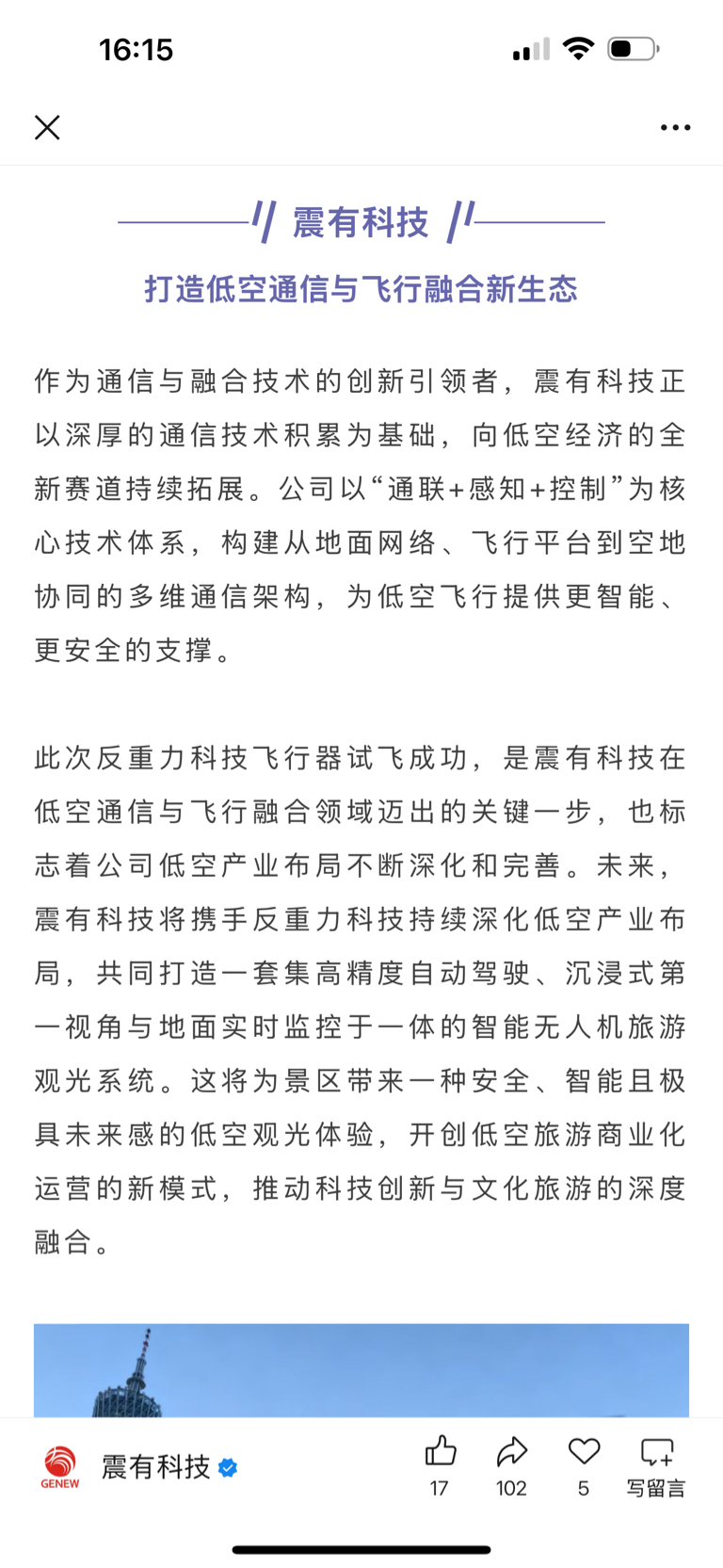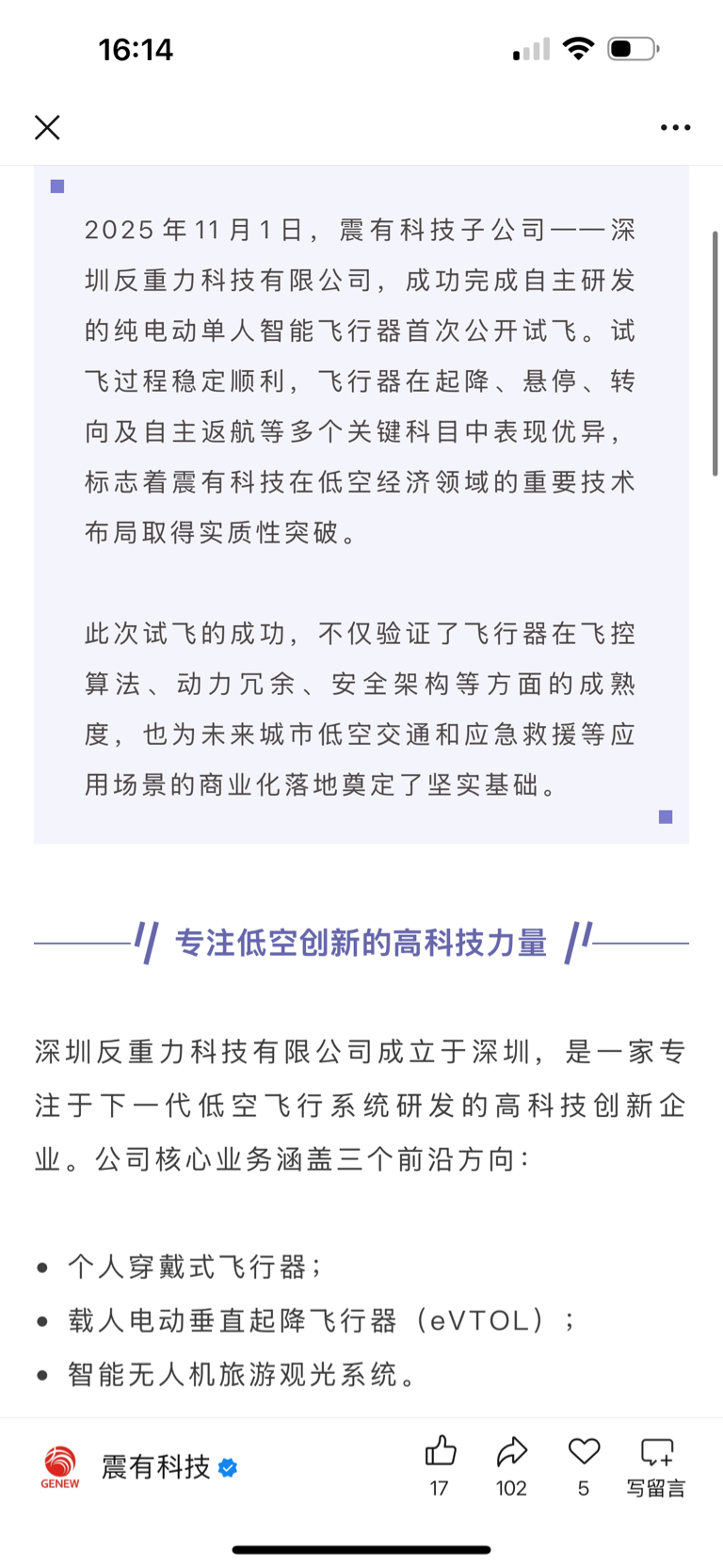 $震有科技(SH688418)$ 飞行器也出来了,并且是将通信技术应用在飞行器上,以通联+感知+控制为核心技术体系,为低空经济的有序发展提供安全保障。可以让飞行器飞的更安全,低空安全保障未来必是主流。