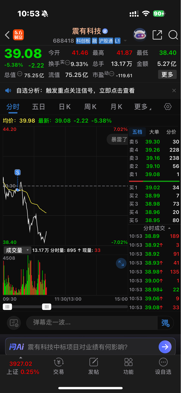 $震有科技(SH688418)$ 昨天没清仓完,今天终于清仓了,不见
