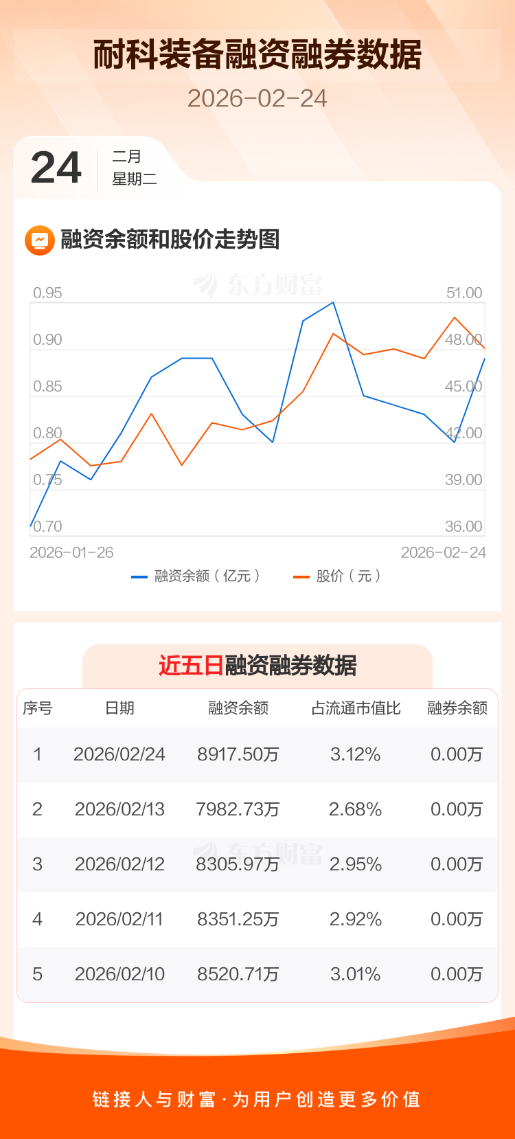 交易所最新数据显示,耐科装备于2026年2月24日获融资买入2697.08万元,融资偿还1762.31万元,当日融资净买入934.77万元。目前,该股融资余额8917.50万,占流通市值比例为3.12%。