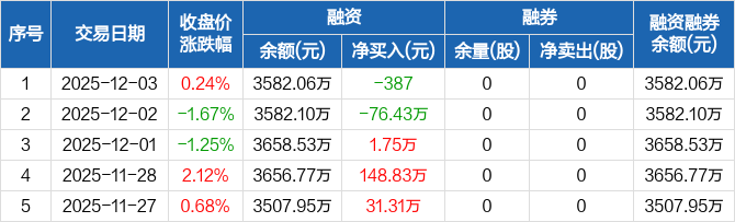 美腾科技:融资净偿还387元,融资余额3582.06万元(12-03)