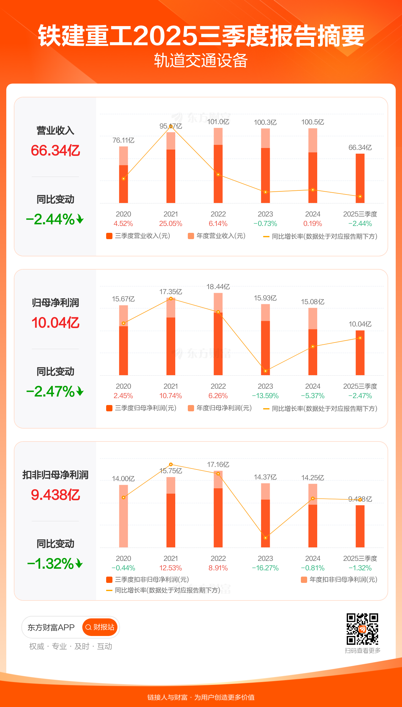 铁建重工10月30日发布2025年三季报显示,公司前三季实现营业收入66.34亿元,同比下滑2.44%;归母净利润10.04亿元,同比下滑2.47%;扣非归母净利润9.44亿元,同比下滑1.32%。