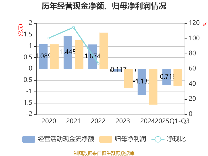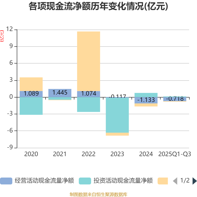 2025年前三季度,公司经营活动现金流净额为-7182.46万元,同比增加2100.28万元;筹资活动现金流净额-1020.26万元,同比增加4106.71万元;投资活动现金流净额1119.59万元,上年同期为7005.01万元。
