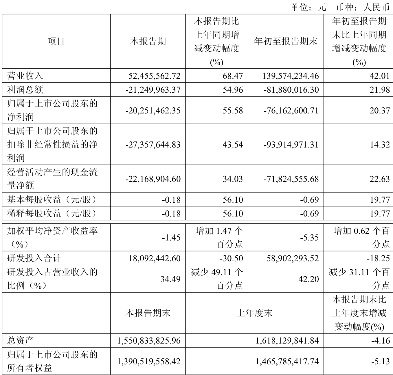 中证智能财讯康为世纪(688426)10月31日披露2025年第三季度报告。前三季度公司实现营业总收入1.4亿元,同比增长42.01%;归母净利润亏损7616.26万元,上年同期亏损9565.14万元;扣非净利润亏损9391.5万元,上年同期亏损1.1亿元;经营活动产生的现金流量净额为-7182.46万元,上年同期为-9282.73万元;报告期内,康为世纪基本每股收益为-0.69元,加权平均净资产收益率为-5.35%。
