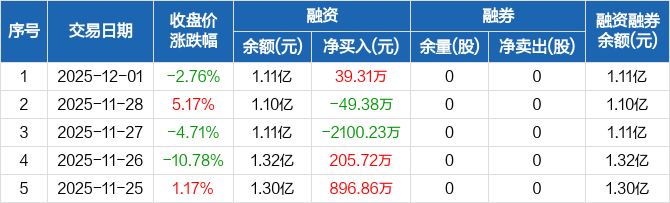 融资方面,当日融资买入754.51万元,融资偿还715.2万元,融资净买入39.31万元。融券方面,融券卖出0股,融券偿还0股,融券余量0股,融券余额0元。融资融券余额合计1.11亿元。