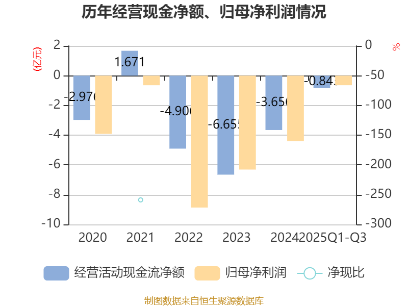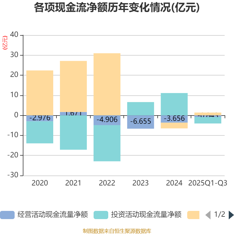 2025年前三季度,公司经营活动现金流净额为-8433.81万元,同比增加2.49亿元;筹资活动现金流净额1.38亿元,同比增加4亿元;投资活动现金流净额-3.21亿元,上年同期为13.59亿元。