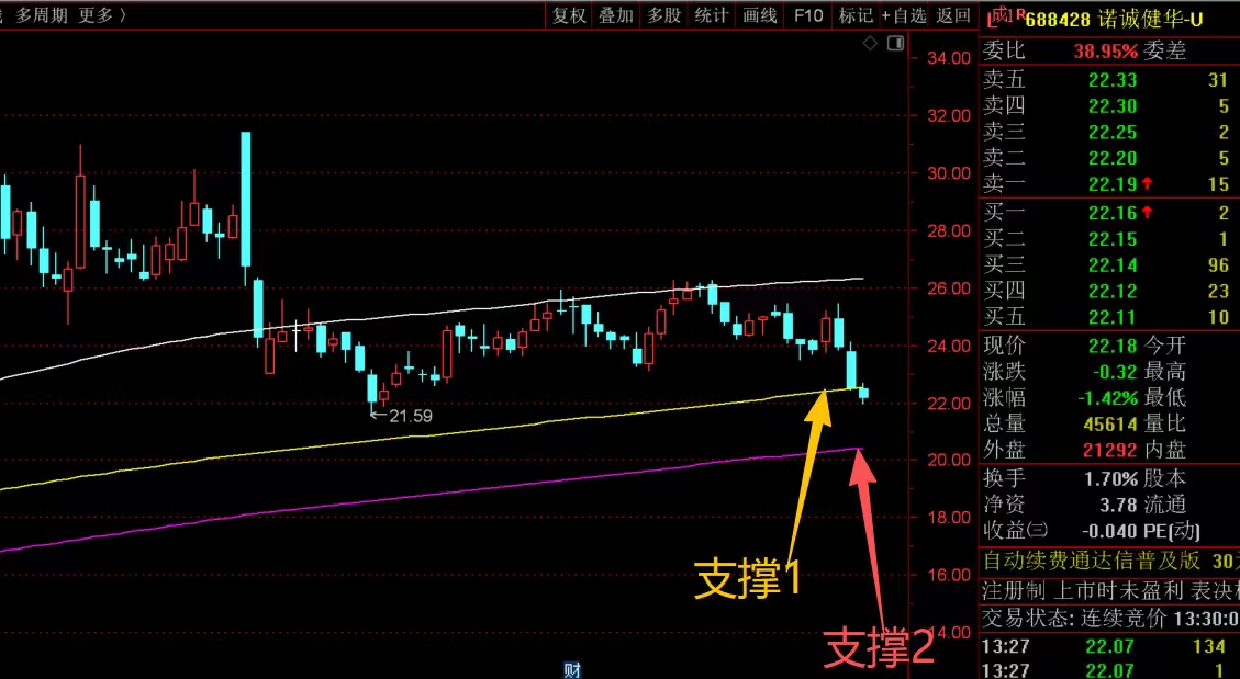 $诺诚健华-U(SH688428)$ 中期趋势走弱了,前期高位回落下来,跌破了白色大均线后,没有能拉起来站稳,这两周继续回落,接下来重点就看脚底22.57-20.43这两个大均线的支撑,能稳住就还能观察反抽动作,如果最后一条都跌破,中期就破位了,大幅减仓应对,不用纠结。