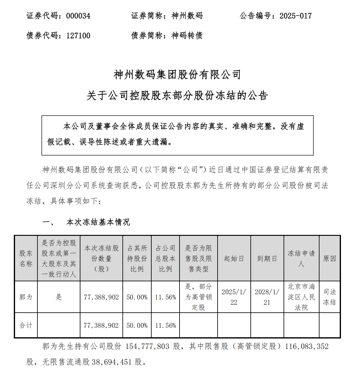 2024年,郭为在北京市海淀区人民法院起诉前妻郭郑俐,请求判令离婚并进行财产分割。2025年1月,北京市海淀区人民法院对郭为持有的约7739万股神州数码股份实施司法冻结,占其所持股份的50%、占公司总股本的11.56%,其中部分为高管锁定股,冻结期限为2025年1月22日至2028年1月21日。