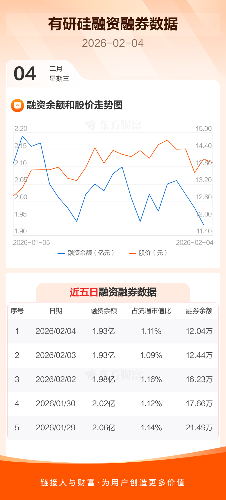 交易所最新数据显示,有研硅于2026年2月4日获融资买入1070.15万元,融资偿还1060.18万元,当日融资净买入9.96万元。目前,该股融资余额1.93亿,占流通市值比例为1.11%。