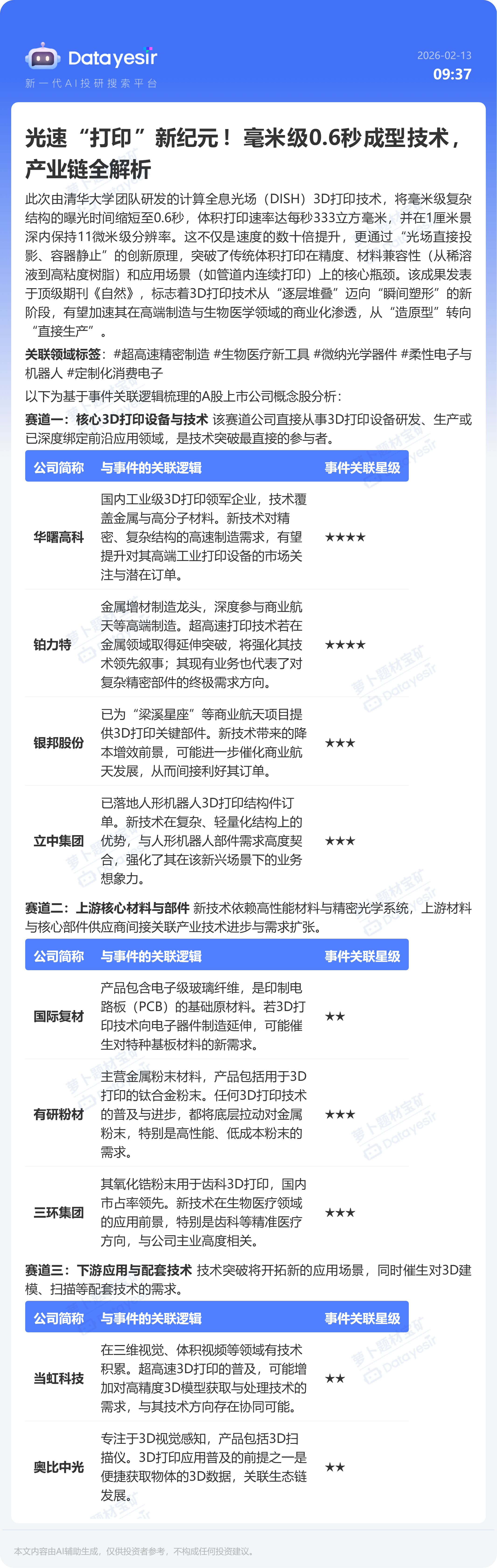 光速“打印”新纪元!毫米级0.6秒成型技术,产业链全解析