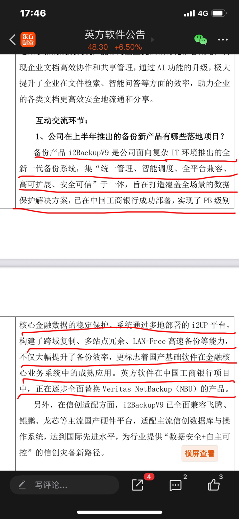 英方软件(688436)在工行全面替换美国公司veritas的NetBackUp软件,整体价值及含金量及高。国内唯一可与美国公司veritas相提并论并能替代的软件公司。接下来就是做其他各大银行的替代,整体空间十倍以上。这个替换,国产还有哪个这么牛掰?$英方软件(SH688435)$