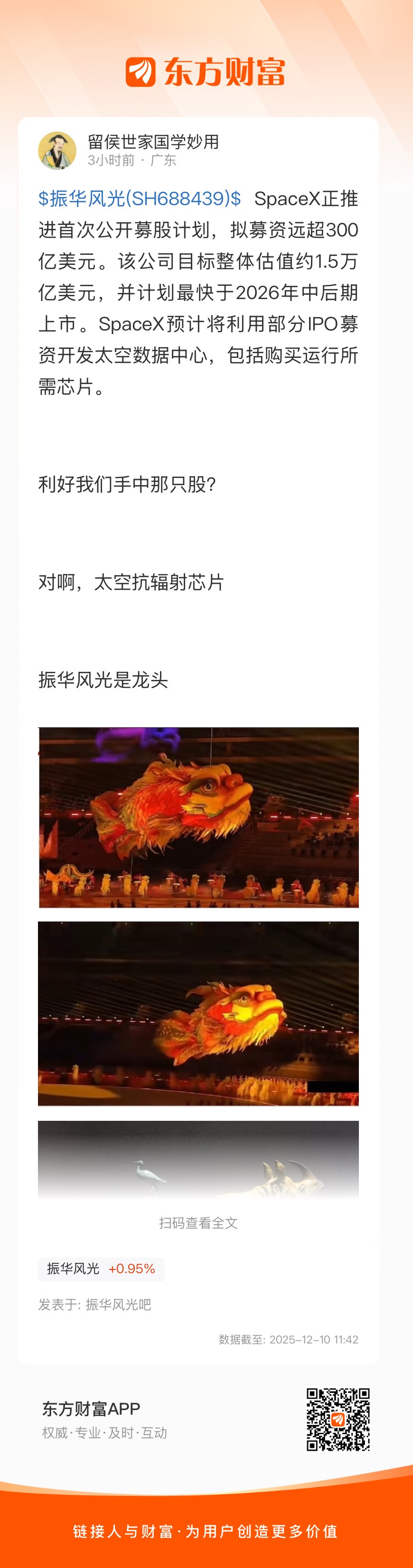 $振华风光(SH688439)$ SpaceX正推进首次公开募股计划,拟募资远超300亿美元。该公司目标整体估值约1.5万亿美元,并计划最快于2026年中后期上市。SpaceX预计将利用部分IPO募资开发太空数据中心,包括购买运行所需芯片。