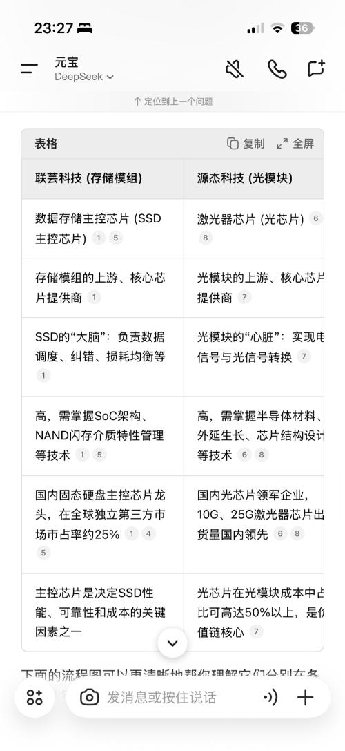 元宝说:通过以上对比可以看出,联芸科技和源杰科技的角色相似性主要体现在三个方面:1. 核心地位相似:两者都位于产业链上游,提供的芯片都是下游模组产品的“心脏”或“大脑”,直接决定了最终产品的性能、可靠性和核心成本 。2. 技术驱动角色相似:它们都是典型的技术密集型公司,通过持续的高强度研发投入(如联芸科技2025年上半年研发费用率高达40.89% ),推动整个产业链的技术迭代(如从PCIe 4.0向PCIe 5.0演进,或向更高速率的光芯片发展)。3. 战略意义相似:两家公司都是各自领域国产替代的领军企业,其技术和产品的突破对保障国内信息技术产业供应链的安全与自主可控具有重要战略价值 。