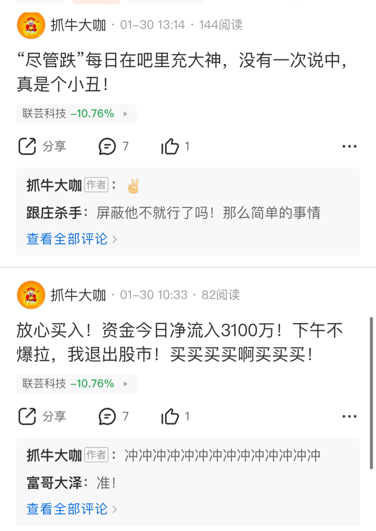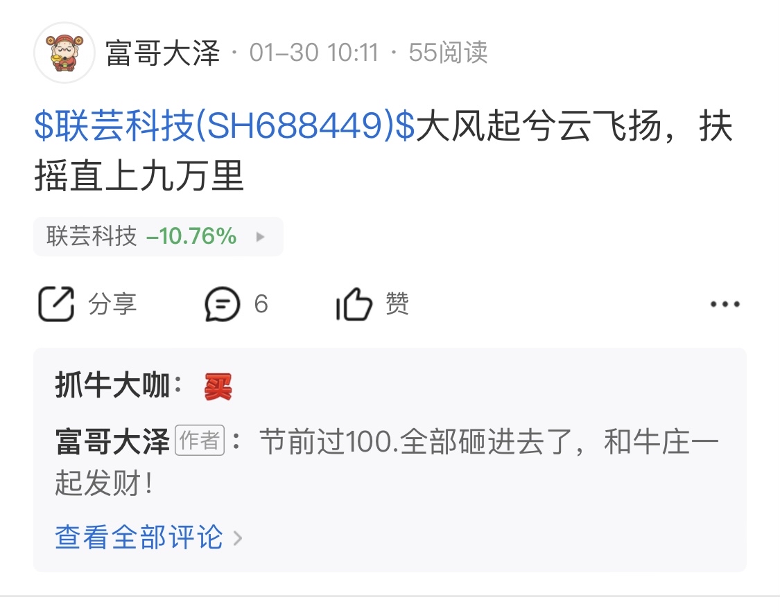 $联芸科技(SH688449)$ “抓牛大咖”“富哥大泽”你们二位周五可是说全仓进入看100以上哦,我周五说让大家涨6个点的时候逃离,你们还骂我,怎么今天你们俩就变脸了呢?你们俩周五不是疯狂喊大家买入吗?好像两个跳梁小丑啊