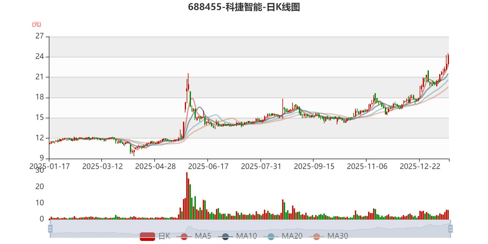 中证智能财讯科捷智能(688455)1月16日晚间披露2025年度业绩预告,预计2025年实现营业收入21.5亿元至24.5亿元,同比增长54%-76%;归母净利润2950万元至3400万元,上年同期亏损5862.68万元;扣非净利润预计900万元至1350万元,上年同期亏损7448.22万元。以1月16日收盘价计算,科捷智能目前市盈率(TTM)约为119.8倍-138.07倍,市净率(LF)约4.77倍,市销率(TTM)约1.77倍。