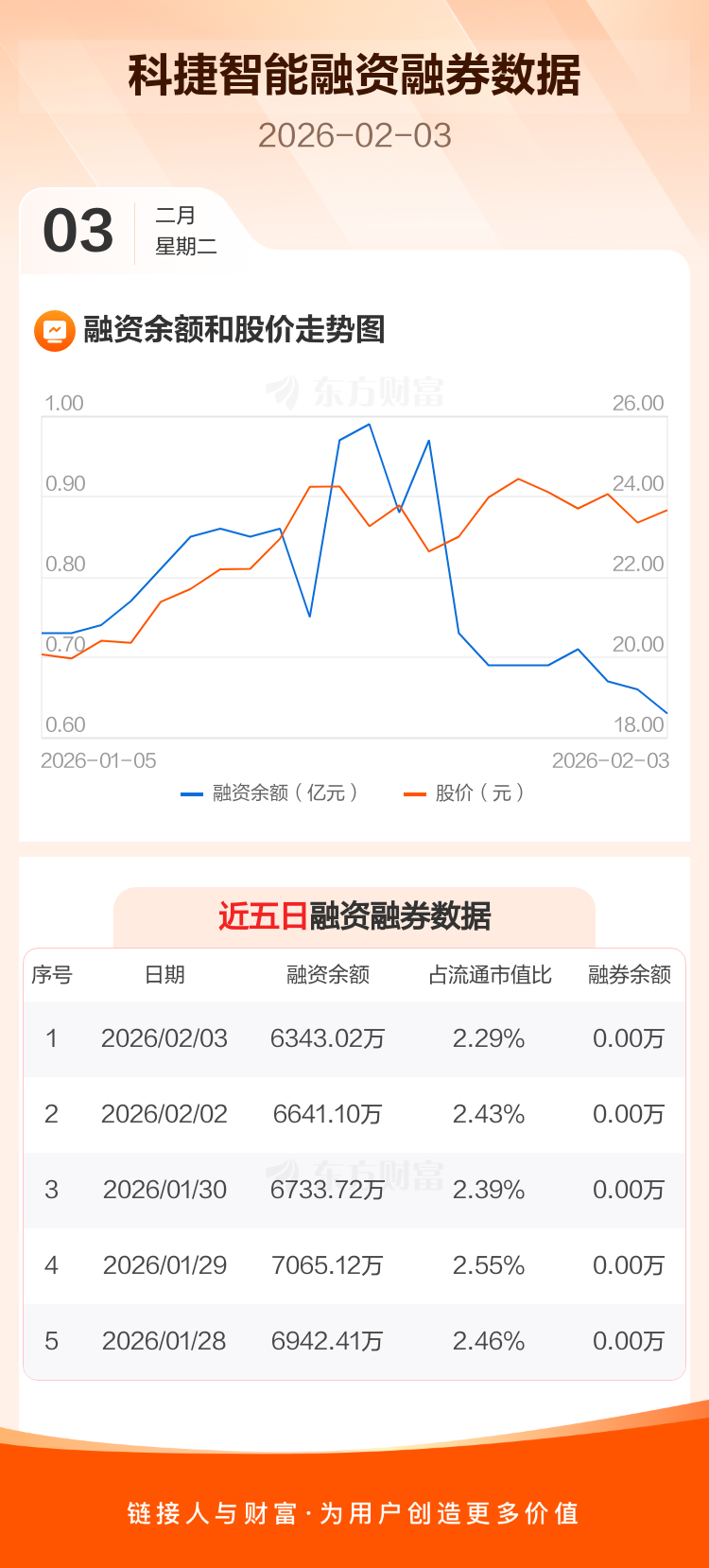交易所最新数据显示,科捷智能于2026年2月3日获融资买入471.84万元,融资偿还769.92万元,当日融资净偿还298.08万元。目前,该股融资余额6343.02万,占流通市值比例为2.29%。