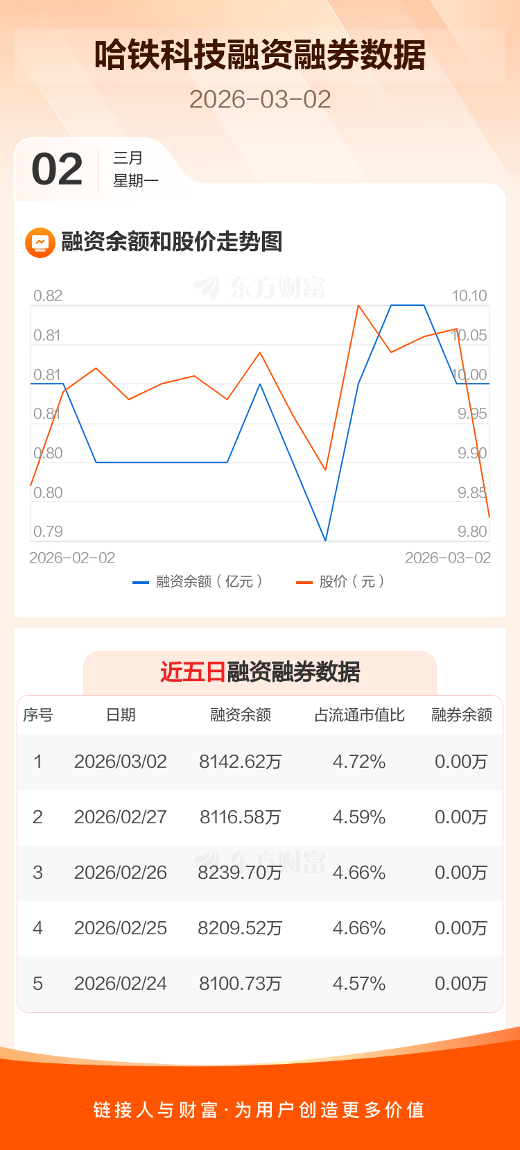 交易所最新数据显示,哈铁科技于2026年3月2日获融资买入524.14万元,融资偿还498.10万元,当日融资净买入26.04万元。目前,该股融资余额8142.62万,占流通市值比例为4.72%。