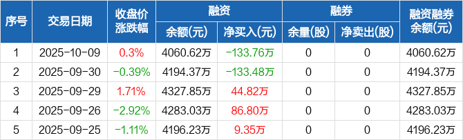 融资方面,当日融资买入168.51万元,融资偿还302.26万元,融资净偿还133.76万元。融券方面,融券卖出0股,融券偿还0股,融券余量0股,融券余额0元。融资融券余额合计4060.62万元。