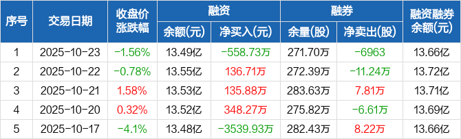 芯联集成:融资净偿还558.73万元,融资余额13.49亿元(10-23)