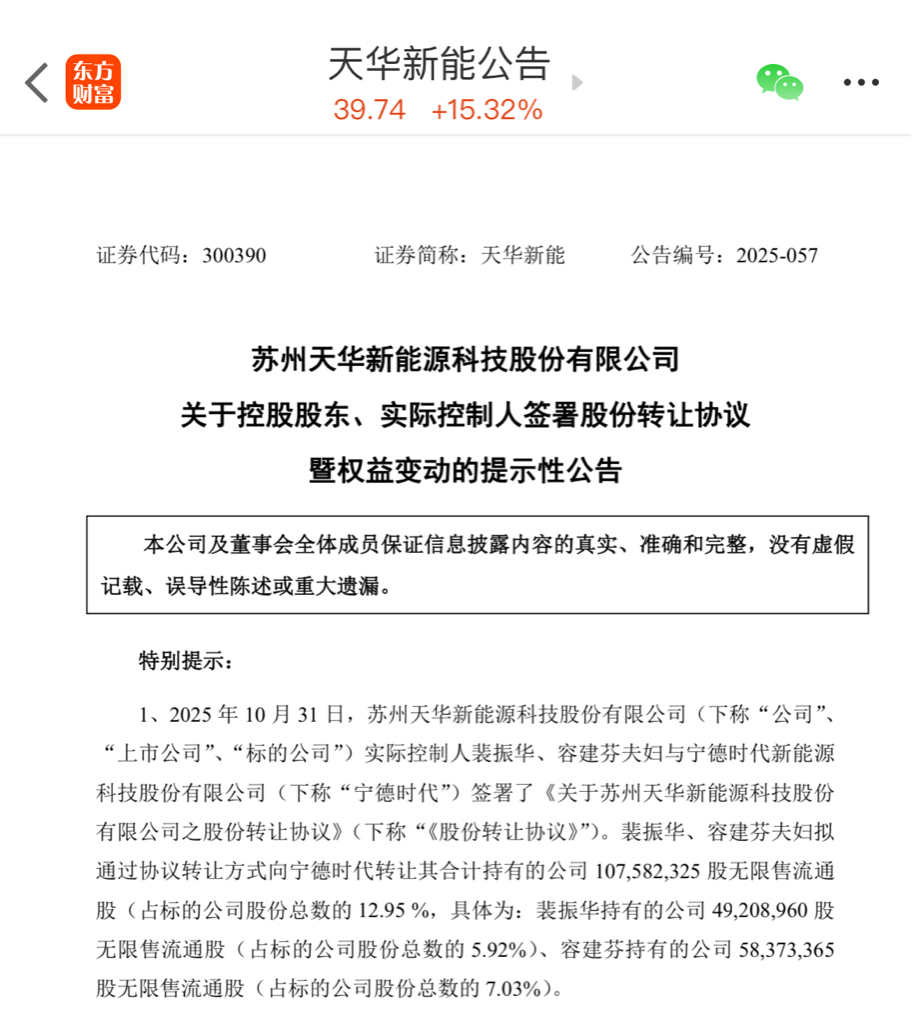 一则26亿元的股权交易公告,让低调富豪裴振华、容建芬夫妇意外“出圈”。很少有人知晓,这位天华新能的实控人,藏着一段中国资本市场最传奇的投资故事——10年前以8900万元押注未上市的宁德时代,如今斩获超1100亿元回报,上演了一场“滴水之恩,银河相报”的商业佳话。